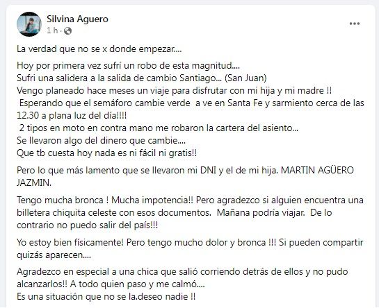 La víctima se llama Silvina Agüero. Según su relato, había ido a Cambio Santiago, local ubicado sobre calle General Acha, en Capital. "Vengo planeado hace meses un viaje para disfrutar con mi hija y mi madre", explicó en su Facebook.