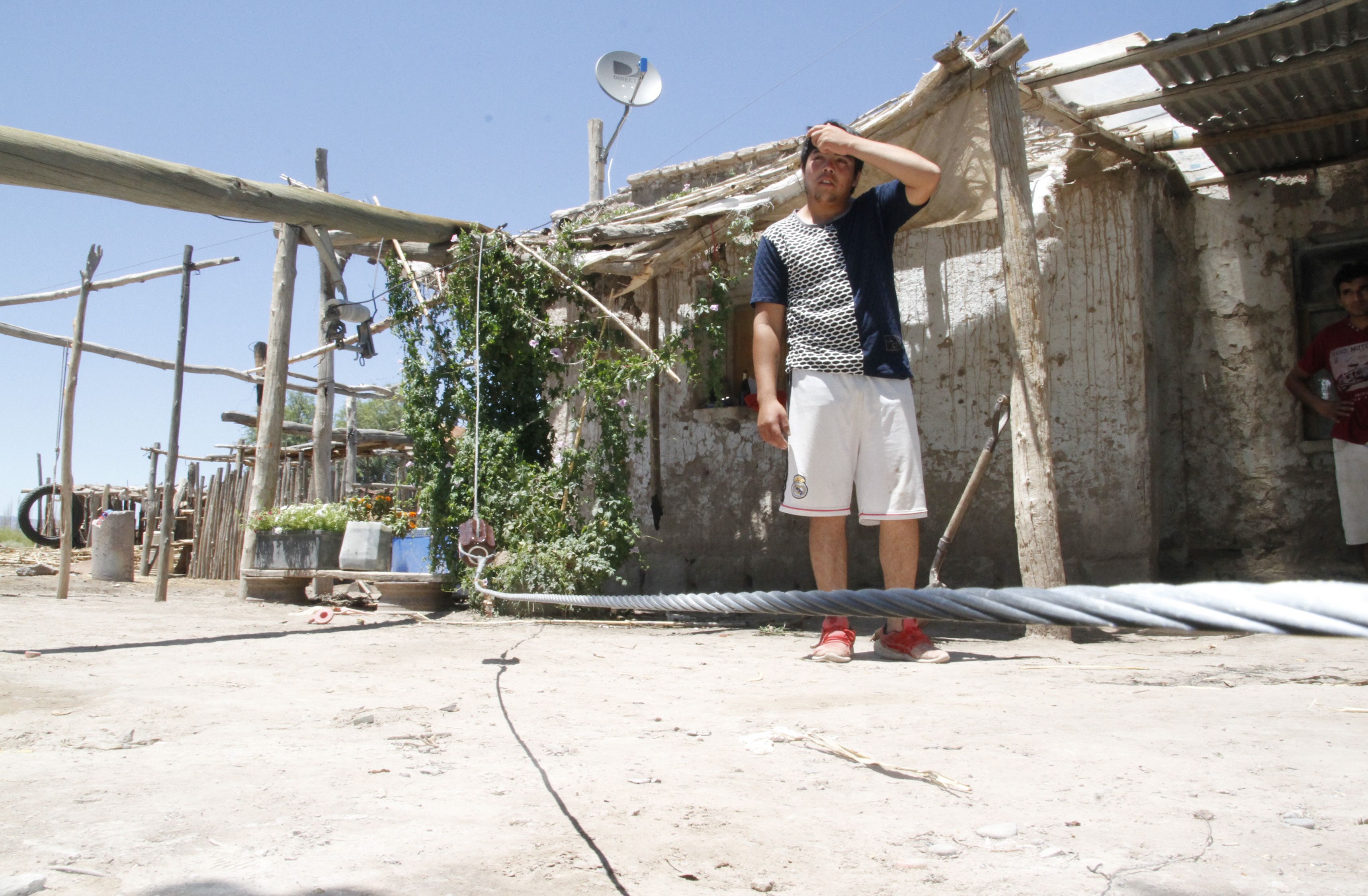 Las fuertes ráfagas de viento que azotaron a gran parte de San Juan provocaron que un poste de luz de madera ubicado justo en el frente de su casa se quebrara y cayera sobre el techo de la vivienda de adobe.