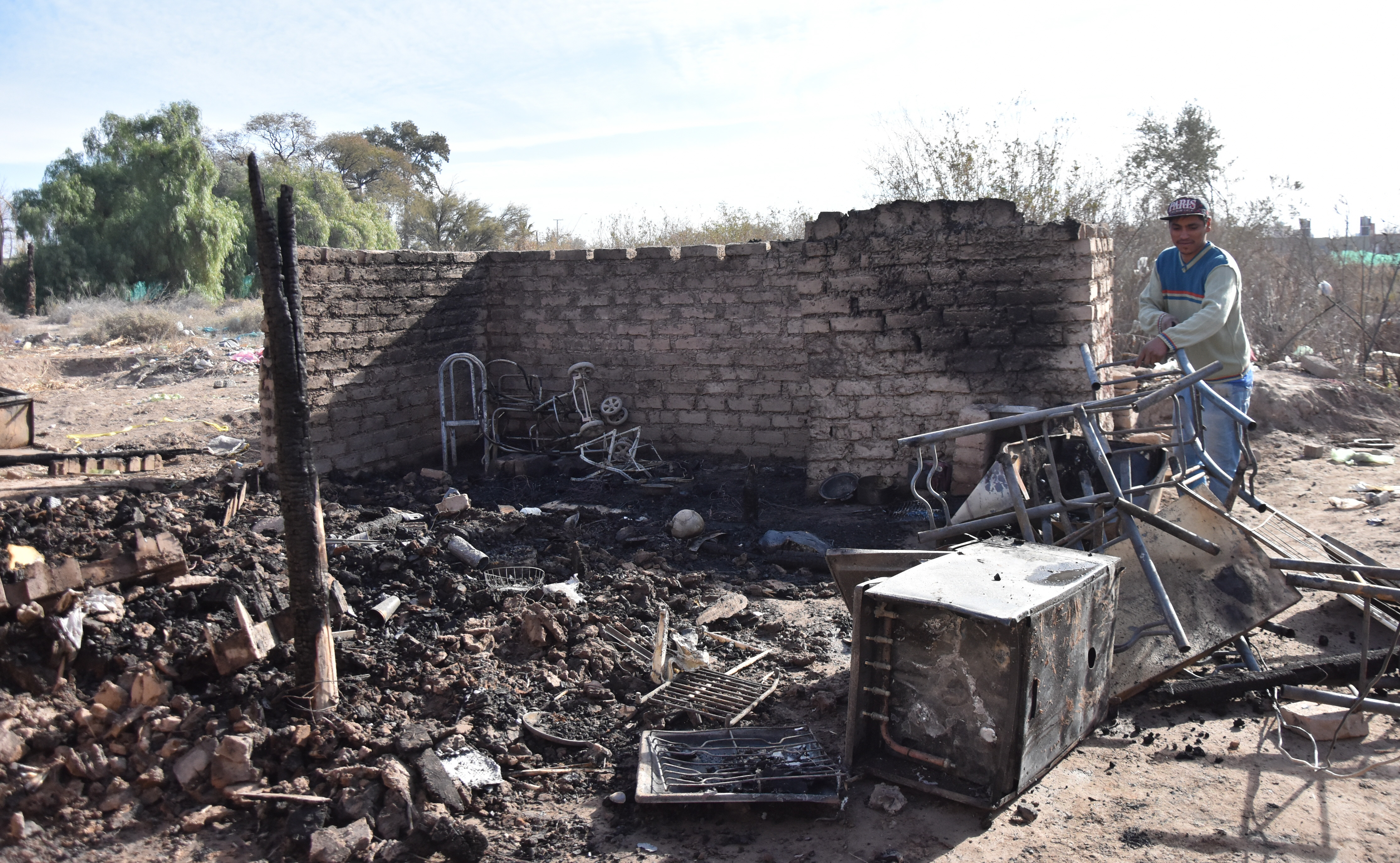 El inicio del invierno coincidió en la vida de Miriam González (25) con una circunstancia muy dañina: fue también el día en que apenas salió de madrugada a lo de un pariente en busca de un plato de comida para sus dos hijos (uno de ellos postrado) y alguien le prendió fuego a su rancho de un único ambiente y la dejó prácticamente en la calle. La hipótesis de un incendio intencional es la principal que surgió entre los bomberos (voluntarios y de la Policía) cuando fueron a la casa de la mujer que vivía en Calle 13 al Este de Aberastain, en el asentamiento "Los Pozos", en Pocito.