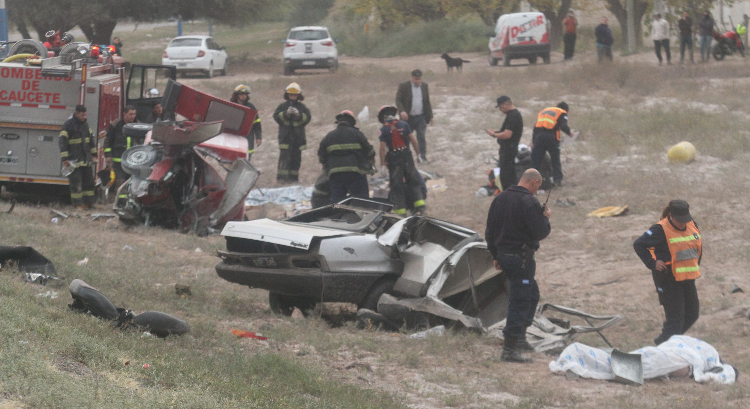 Un espectacular choque entre dos vehículos en 9 de Julio se cobró la vida ayer de dos hombres y un niño, mientras que tres personas sufrieron graves heridas, informó la Policía. Las víctimas fatales son Gabriel Guevara (44), su hijo Tobías Guevara (13) y Ceferino Pereyra (48), precisaron. Es la mayor tragedia en la provincia en lo que va del año. Todo ocurrió alrededor de las 16. Gonzalo Aciar (27) conducía un Fiat Regatta y lo acompañaban Renzo Carmona (26), su hermano Pedro (25) y el padrastro de ambos, Ceferino Pereyra. Los cuatro albañiles habían estado trabajando en Capital y regresaban a su Caucete natal. Pero cuando iban de Oeste a Este por Ruta 20, Aciar perdió el control del rodado, se cruzaron de carril y unos 300 metros antes de llegar al puente de Caucete, en una curva, impactaron de frente con una Fiat Fiorino, conducida por Gabriel Guevara, que iba con su hijo Tobías.
