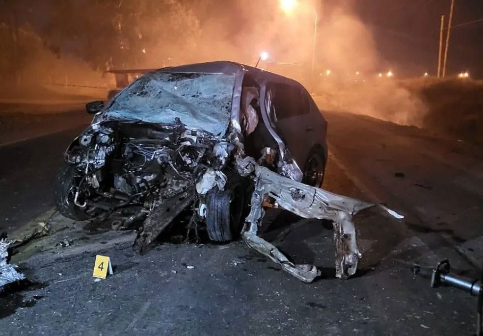 En el asfalto, las marcas de caucho quemado de los neumáticos indicaban un último intento del conductor para evitar el violento impacto contra un gran eucalipto. Pero esa brusca maniobra no alcanzó: el auto quedó completamente destruido en su frente, con varias partes desprendidas de su estructura (como el motor, que de paso inició un incendio en pastizales), dar un trompo y quedar apuntando en el sentido inverso al que circulaba. La peor parte de ese tremendo choque la sufrió su conductor, que perdió la vida a pesar de llevar puesto el cinturón de seguridad y de que dos de los airbags se activaron.
