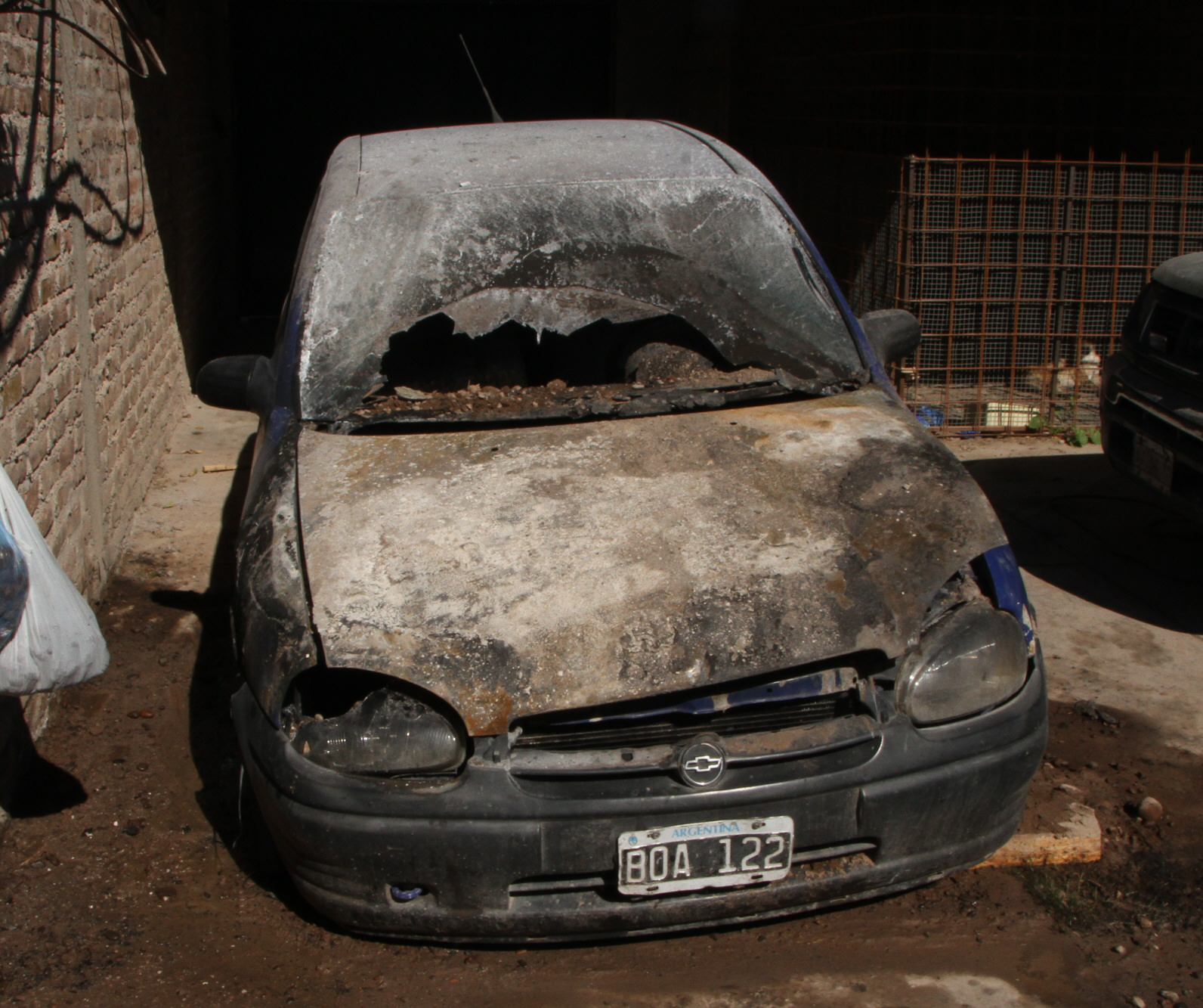 ‘Puse a recargar la batería en la mañana y después le quité el cargador. Bajé el capot y el auto quedo ahí. Nadie lo movió’, explicó Arias. No notó nada extraño hasta la noche, cuando una vecina llamó asustada a su puerta y le avisó que su auto se estaba prendiendo fuego en el fondo. ‘Nos gastamos todos los matafuegos y no apagábamos el incendio. Menos mal que estaban unos pibes que siempre se juntan en la plaza. Si no fuera por ellos, esto hubiese sido peor’, relató Arias, quien explicó que tuvo suerte que no ardiera una camioneta 4×4 que estaba cerca del Corsa.