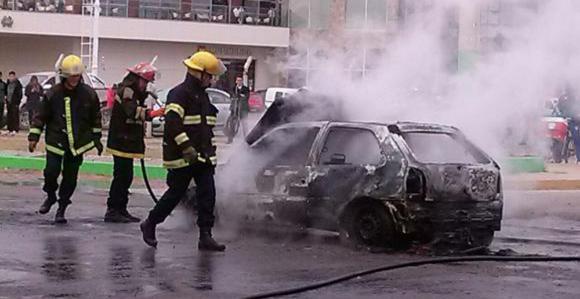 �Un VW Gol quedó destruido por completo ayer a las 13.20 tras incendiarse por un presunto problema eléctrico en plena avenida Ignacio de la Roza, frente a un conocido hipermercado de Rivadavia. Según la Policía, el auto era conducido por José Conti (20) y salió ileso.