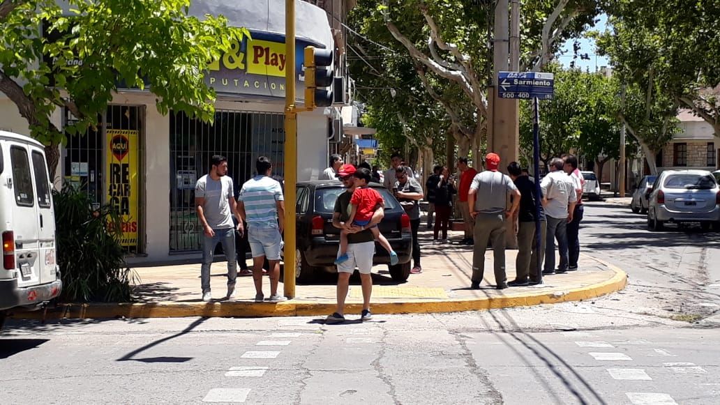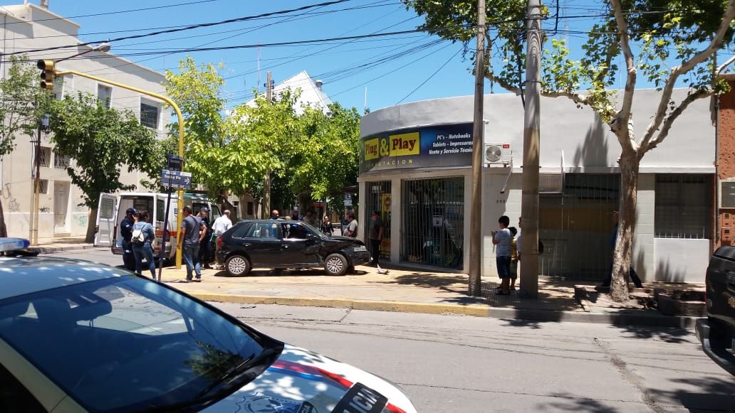 Según informaron testigos del hecho, un Volkswagen Gol que circulaba por Santa Fe chocó contra un Citroen Xsara Picasso que viajaba por Sarmiento (uno de los vehículos pasó con el semáforo en rojo). Producto de la colisión, el Gol cruzó el cordón de la esquina Suroeste y se metió en la vereda, impactando contra la pared de un local de informática y rompiendo las rejas y algunos vidrios.
