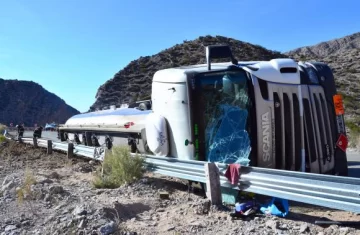 �Un camionero de 42 años pasó un gran susto cerca de las 9 de ayer, al perder del control y volcar con el gasoil que llevaba para trabajos mineros. Todo pasó cuando salía de una curva en la ruta 436, unos 5 km después de los ‘Baños de Talacasto’, en Ullum. En la Policía, suponen que el accidente que le dejó heridas leves al chofer Jorge Daniel González, se produjo por la rotura de un neumático que desestabilizó al pesado rodado.