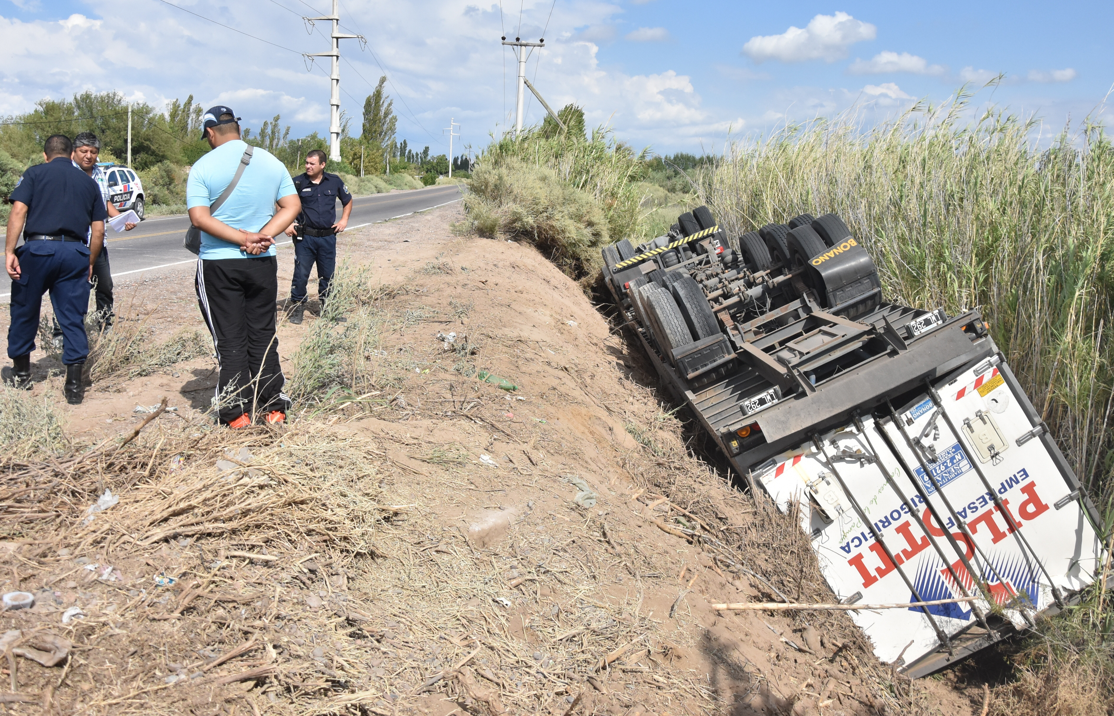El que pudo contar la historia es Nemecio Muñoz (55), quien sufrió el accidente ayer a las 6 de la mañana en la ruta 155, al Este de calle Garibaldi. El chofer venía de la localidad de Adela, en La Pampa, con un cargamento de carne vacuna en un camión Volvo con caja térmica y semiacoplado. Muñoz aseguró que al tomar la curva se le cruzó un motociclista y ahí apretó los frenos, pero el vehículo se fue hacia la banquina y perdió la estabilidad. El camión recorrió como 20 metros hasta que se perdió al desagüe y quedó dado vuelta en el fondo. El camionero sufrió pequeños cortes.