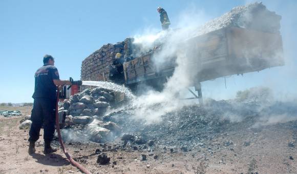 "Yo creo que se perdió la mitad de la carga. La traía de Río Muerto, en Chaco, y la llevaba a Chile donde pagan unos 80.000 dólares la carga. Empecé a ver humo de golpe y entonces desenganché el camión para ir a pedir ayuda, a más de uno ya le pasó esto", decía ayer Sebastián Moreno (23) mientras seguía con atención el trabajo de los bomberos a cargo del oficial ayudante Daniel Domínguez.