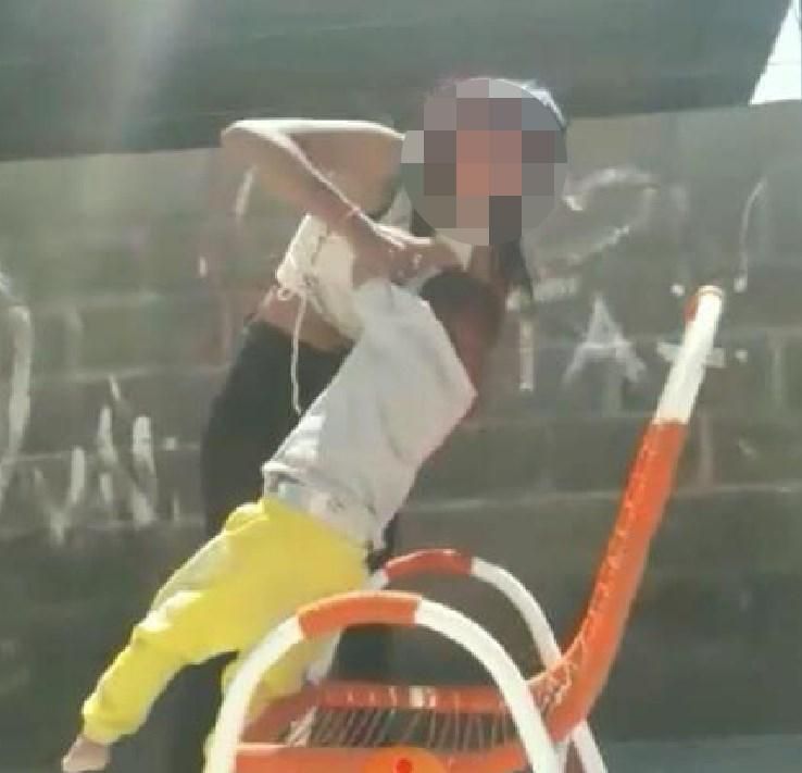 En las imágenes se observa a la mujer desencajada: la madre le propina a su pequeño hijo varias trompadas y patadas, después lo sujeta de los brazos y lo arrastra unos metros, para terminar arrojándole con furia una zapatilla en la cabeza.