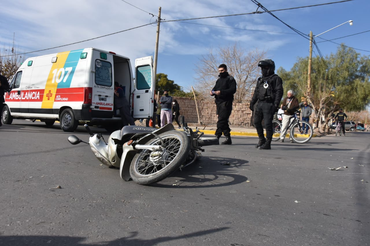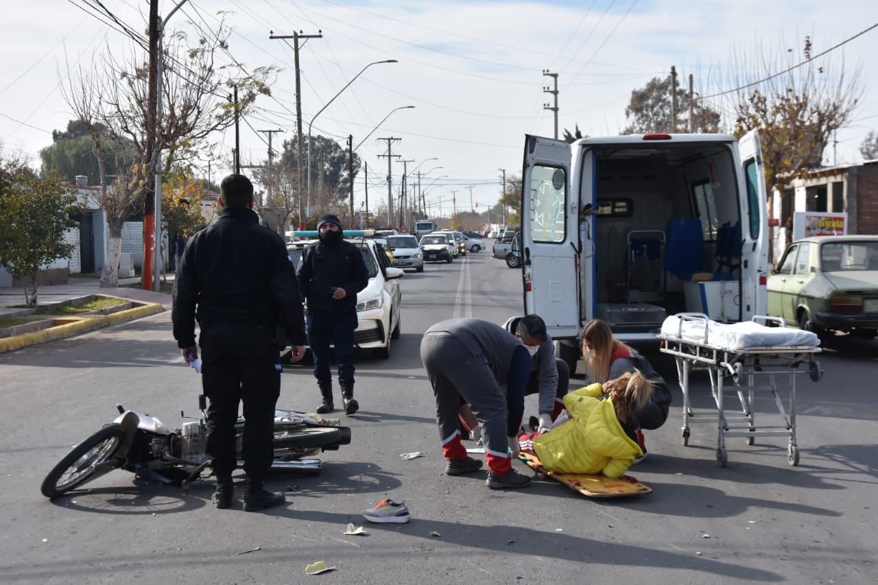 Durante la mañana de hoy se produjo un fuerte accidente de tránsito en Chimbas, cuando una mujer que circulaba en moto chocó violentamente contra un vehículo. Según informaron fuentes policiales, la joven de apellido Giménez terminó con una fractura expuesta en su pierna derecha.
