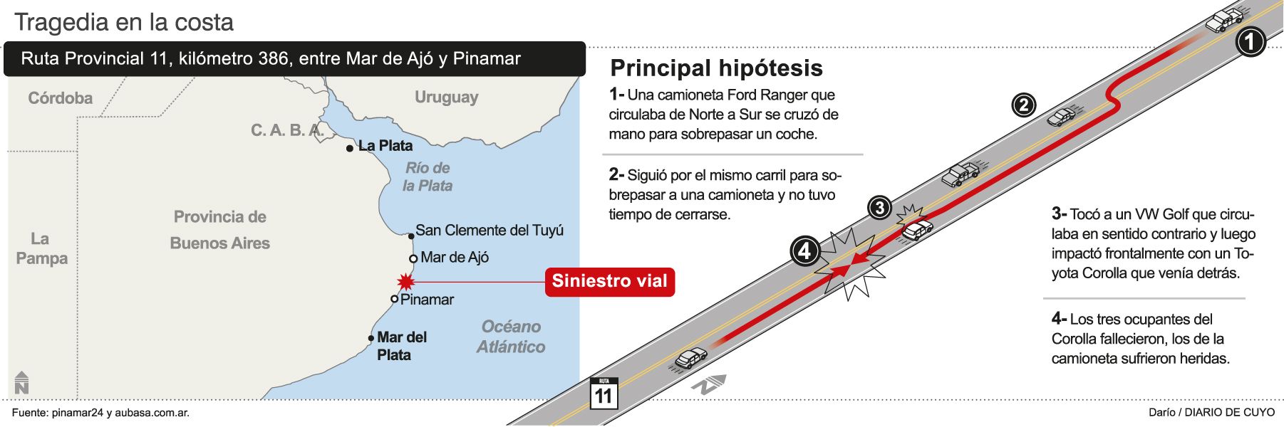 Nada de lo que planeaban pudo ser posible porque todo terminó de la peor manera. Los destinos de los tres quedaron echados en la localidad bonaerense de Pinamar. Allí, a la altura del kilómetro 386 de la ruta interbalnearia 11, los cruzó la tragedia. Fue ese mismo día, el domingo, pasadas las 22. El Corolla era de Alberto pero aparentemente iba manejando su hijo Daniel. Los tres se trasladaban por la ruta 11 en dirección al Norte cuando se estrellaron de frente contra una Ford Ranger. En la camioneta viajaban tres personas oriundas de Madariaga (localidad situada a unos 30 kilómetros de Pinamar), identificadas como Diego Zaupa, Juan Ayciriex y Alfredo Sanmillán. La Policía de allá no informó quién iba manejando.