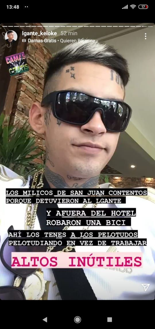 Luego de ser detenido en Rawson por generar disturbios tras realizar una gira durante el fin de semana, Elian Valenzuela, líder de la banda "L-Gante", recuperó la libertad a las pocas horas y se despachó con dureza contra la policía de San Juan.