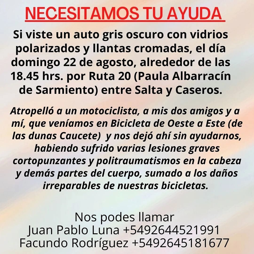 Todo sucedió el pasado domingo, sobre las 18.45, sobre Ruta 20 entre Salta y Caseros, en Caucete. Tres amigos habían salido a andar en bicicleta, cuando un auto los atropelló y se dio a la fuga.