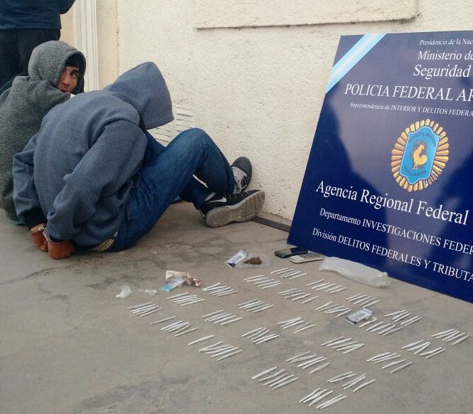 Los efectivos de Delitos Federales y Tributarios de la Agencia Regional Cuyo de la Policía Federal detuvieron ayer tarde a tres jóvenes a quienes les secuestraron cuatro pequeños envoltorios con cocaína, 150 cigarrillos de marihuana y otro envoltorio con la misma droga, informaron en esa fuerza. El operativo se hizo en la calle Salta, en Rawson, y los sospechosos estaban en un Renault Clio estacionado.