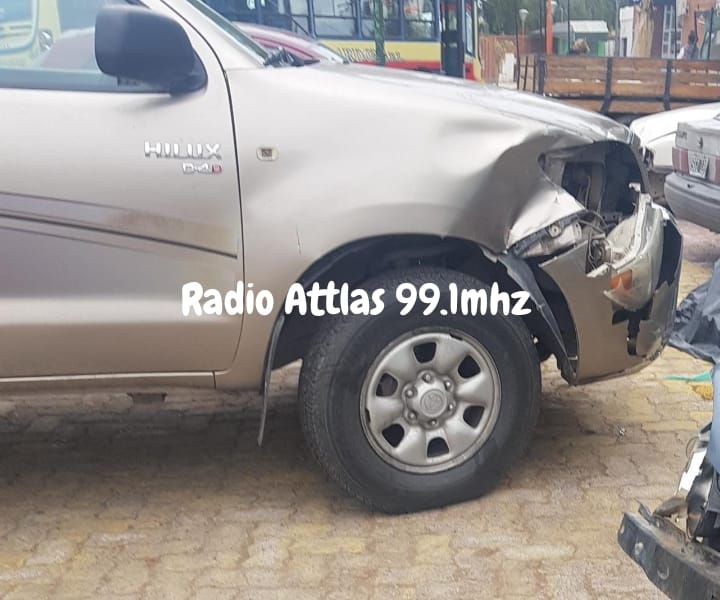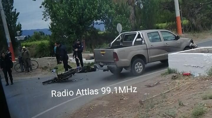 Según informaron desde Radio Attlas, una moto y una camioneta Toyota Hilux colisionaron fuertemente en el cruce de Belgrano y Sarmiento.