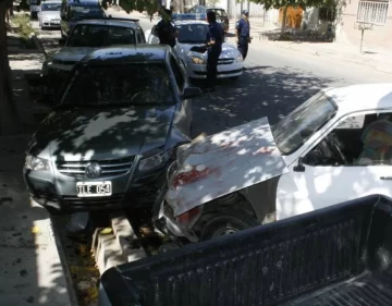 Un conductor perdió el control de su Renault 12 ayer al mediodía y desató un triple choque con otros vehículos que estaban estacionados en calle Comandante Cabot, a 80 metros al Oeste de Mendoza, en Trinidad, Capital. El auto impactó contra una camioneta Chevrolet S-10 y después se estrelló contra un coche Volkswagen Gol, el que se desplazó hacia atrás y golpeó a un Peugeot 504. Los tres rodados colisionados se subieron al cordón. El único herido fue el conductor del Renault, Roberto Barriga (29), quien sufrió un leve golpe en una pierna, informaron en la Seccional 3ra.