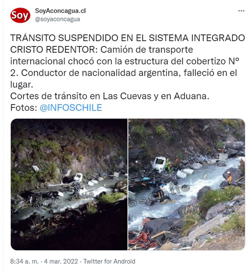 De acuerdo con el medio trasandino Losandesonline.cl, el incidente ocurrió alrededor de las 4.30 del viernes, a la salida del segundo cobertizo, cuando el camionero bajaba desde el sector cordillerano hacia la ciudad de Los Andes y transportaba en un acoplado transformadores de energía eléctrica.