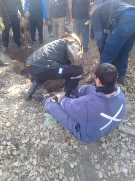 Los bomberos trabajaron alrededor de una hora con cuerdas y otros elementos para ayudar al equino a salir. Finalmente lo lograron y, después de descansar, el animal logró volver a ponerse de pie.