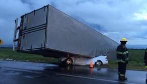 Córdoba.- El acoplado de un camión que transportaba galletas aplastó literalmente a un auto en ruta nacional 9 norte, a la altura de Estación General Paz, unos 35 kilómetros al norte de la Ciudad de Córdoba y unos 20 kilómetros al sur de Jesús María.