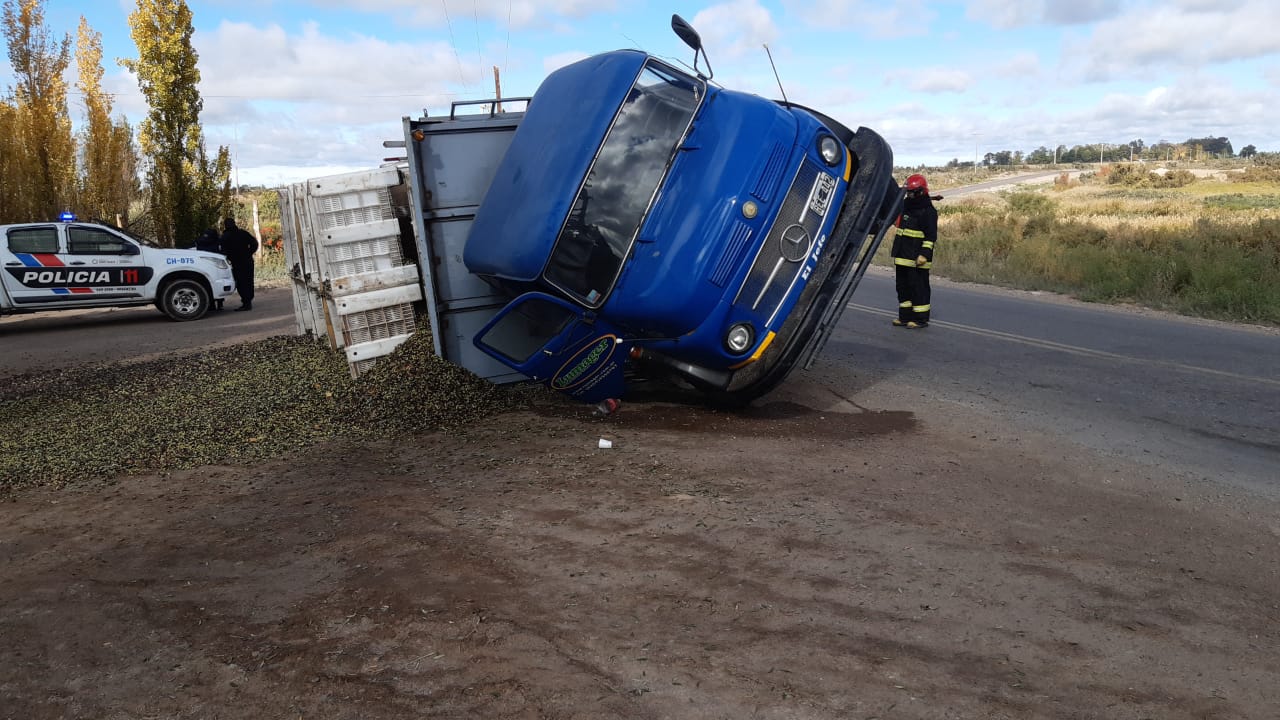 Durante la mañana de este viernes se registró un accidente en Las Chacritas, 9 de Julio, que dejó como saldo un camión volcado, su carga de aceitunas por el suelo y dos ocupantes ilesos.