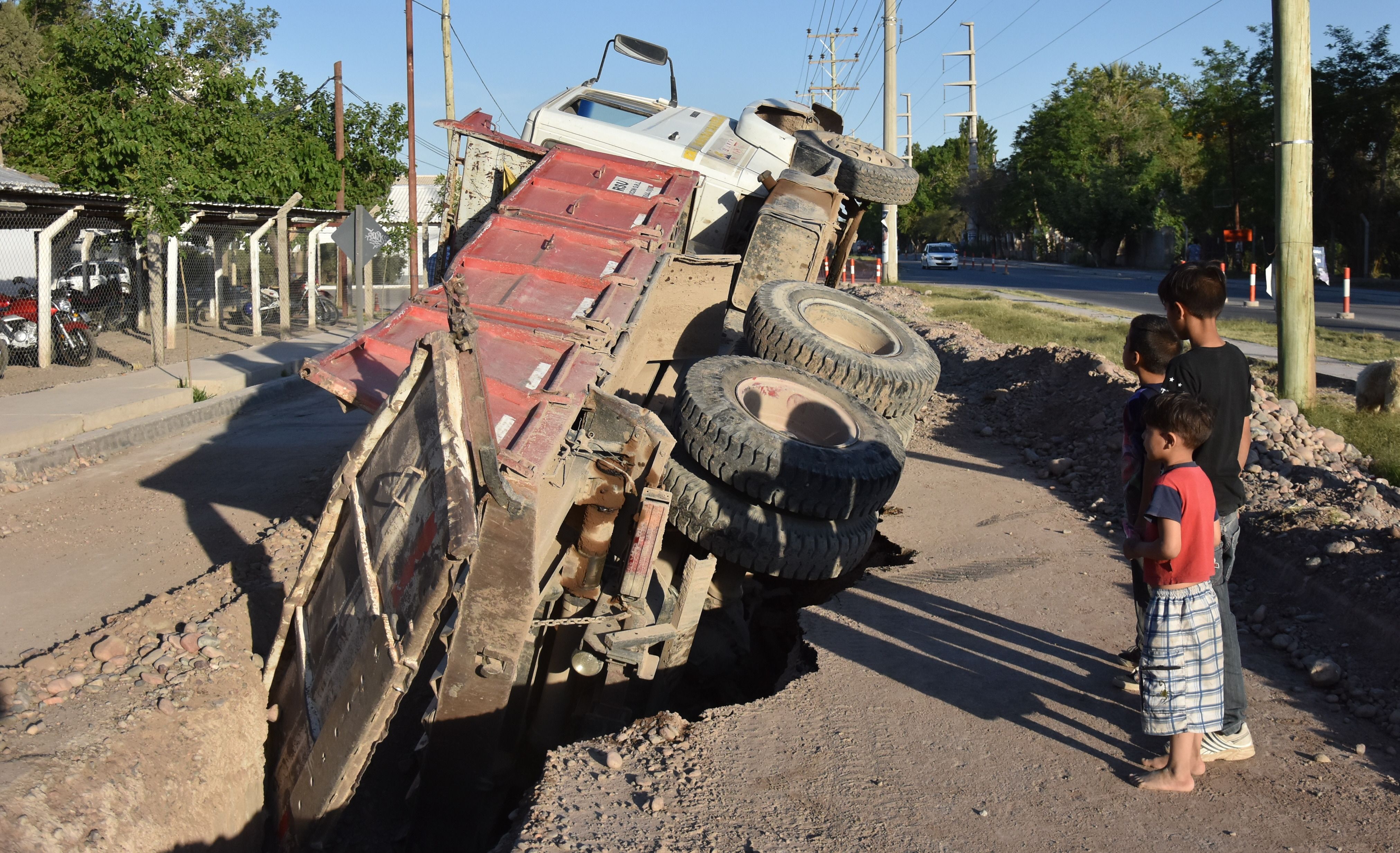 Un camión que rellenaba las zanjas de una red cloacal terminó volcando a raíz del desmoronamiento de parte del pavimento. Esto pasó ayer a las 16.30 en la obra ubicada en la calle Agustín Gómez, entre Frías y Lemos, en Rawson. Alfredo Lucero (37), el chofer del Mercedes Benz de la empresa Cicon, sufrió golpes leves y fue trasladado al hospital, indicaron en la Seccional 6ta.