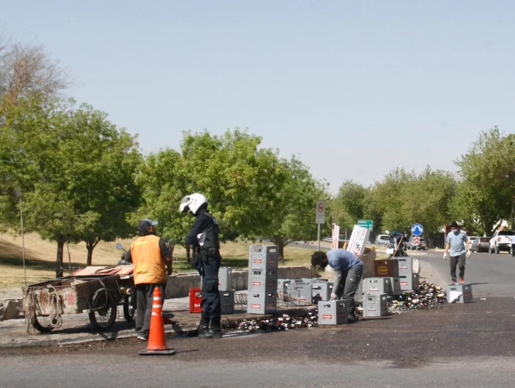 Una mala maniobra terminó con más de 50 cajones de cerveza regados por el Lateral de Circunvalación, en la mañana de este sábado.