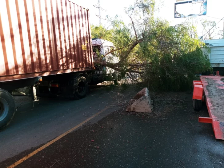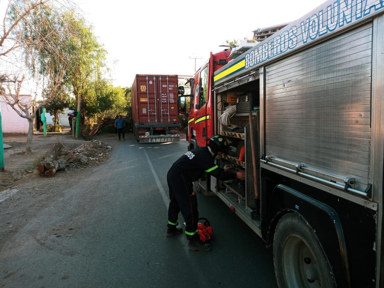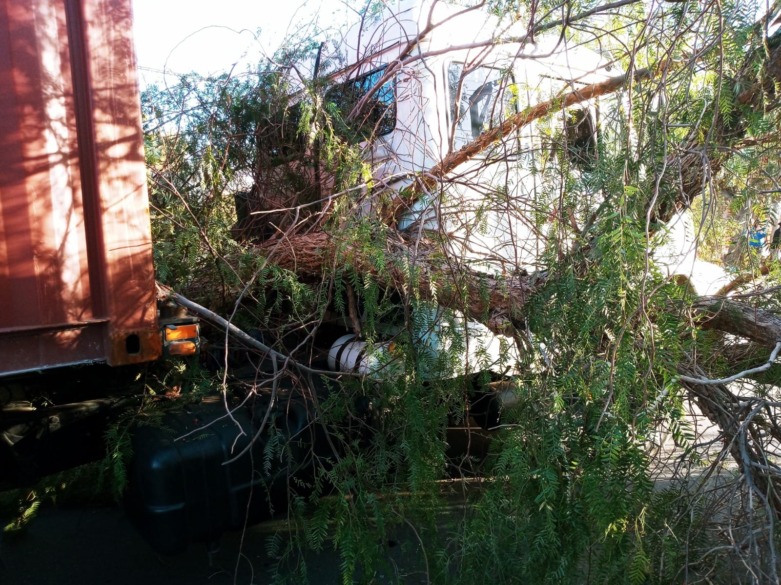 Personal de Bomberos Voluntarios de Chimbas trabajaron para remover un árbol que cayó encima del mismo camión que lo derribó. Según las fuentes, el hecho ocurrió alrededor de las 17.30, en avenida Benavídez y Paula Albarracín de Sarmiento, en Chimbas.