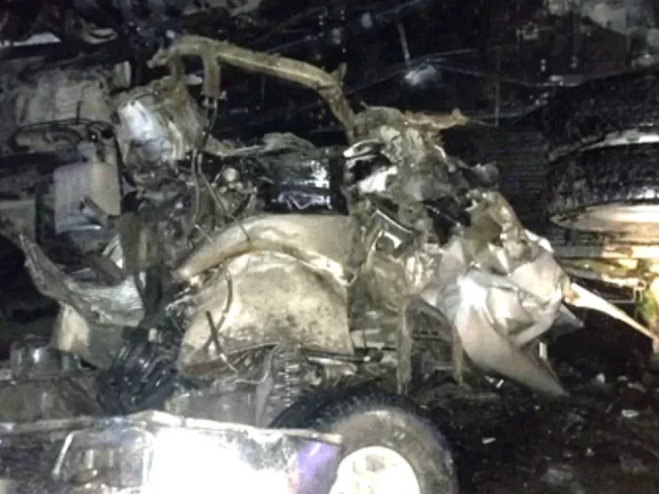 El asfalto mojado y la violenta colisión frontal hizo que el camión volcara y cayera sobre la Ford Ranger que terminó aplastada y compactada. Casi irreconocible.