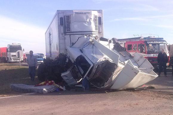 Entre Ríos.- La colisión entre los dos camiones se produjo cuando uno de los pesados vehículos, marca Volkswagen 320, patente HPV 821, del tipo térmico con equipo de frío, no pudo evitar chocar contra un camión tipo tolva, marca Scania 113, patente RPT 289, conducido por una persona domiciliada en Gualeguaychú y que transportaba maíz.