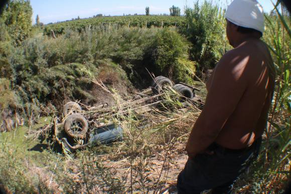 "Se me reventó una rueda y no pude hacer nada por dominar el camión", fue la explicación que dio ayer en la mañana Marcos Salinas, un camionero de 36 años, mientras miraba afligido y lamentándose a cada segundo como quedó el viejo camión Ford 700 cargado con 10.000 kilos de uva que minutos antes había manejado y que por una aparente falla mecánica, terminó ruedas arriba en el fondo de una desagüe en Caucete. Pero el accidente pudo ser mucho peor, porque el camión quedó con su cabina sumergida en el agua y con el chofer lastimado en su cabeza en el interior, luchando por salir. Milagrosamente, el muchacho pudo escapar del interior y luego, un par de vecinos lo pusieron a salvo.