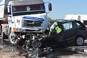 El chofer del vehículo, Alberto González (33, iba a cargar piedras a la zona de Nogolí) se tiró hacia su derecha para evitar el impacto, pero Gómez -según la policía- volanteó hacia su izquierda, provocando que el auto se fuera hacia el mismo costado que el camión y el impacto fue terrible: el nuevo auto se incrustó debajo del camión. Y resultado fue nefasto: el conductor y su yerno iban con el cinturón puesto -precisaron las fuentes- pero eso no los salvó de la muerte. La tragedia también arrasó con la vida de Silvia (viajaba atrás de su marido) y también con la de su hija y la de su futura nieta porque, al parecer, las mujeres viajaban sin el cinturón de seguridad.