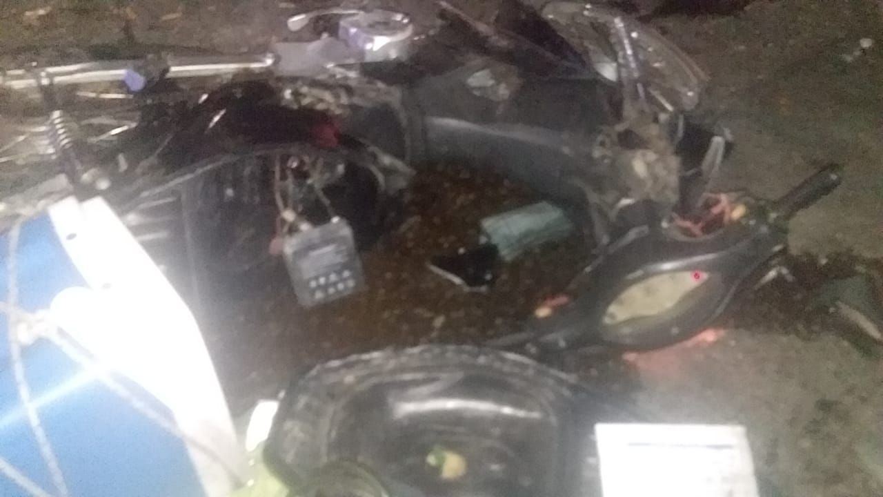 La moto quedó destruida y totalmente debajo del Fiat Idea. El conductor fue trasladado al Hospital Rawson.