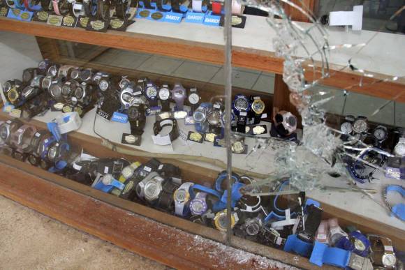 Aparentemente, los jóvenes aprovecharon el viento y la lluvia de la madrugada para dar el golpe. A través de las rejas, los delincuentes se las ingeniaron para romper el grueso vidrio y luego metieron el palo. En esa maniobra, uno de ellos se cortó la mano, pero igual sacaron 32 relojes valuados en unos 2.500 pesos, aseguró Miguel Aguilar, el propietario.