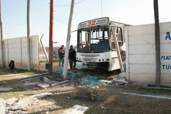 Se cruzó de carril y casi atropelló a una motociclista. Siguió hasta la vereda, arrancó una malla metálica y se estrelló contra un pilar y una muralla del club UVT. Esa alocada secuencia la protagonizó ayer a las 10.45 Miguel Sosa (39), un chofer de colectivo de línea 32 de "Vallecito", que, al parecer, se descompensó cuando circulaba al Sur por calle Mosconi, cerca de Lateral de Circunvalación, en Rawson, según la policía. Iba con dos pasajeros pero no hubo heridos graves.