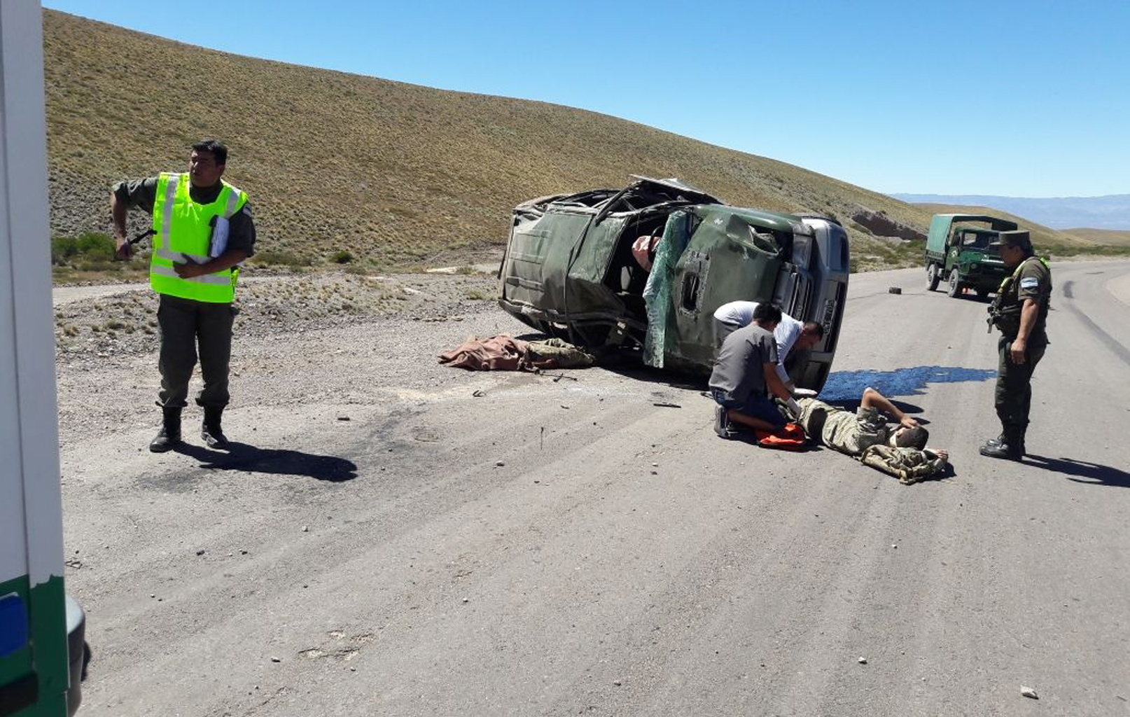 Vuelco fatal. La camioneta Isuzu 4×4 carrozada dio varios tumbos luego de que aparentemente reventó el neumático de una rueda trasera, a la salida de una curva en la Ruta 150, entre la Aduana de Las Flores y el destacamento de Gendarmería, Guardia Vieja. De los 4 militares del Ejército Argentino, uno falleció.