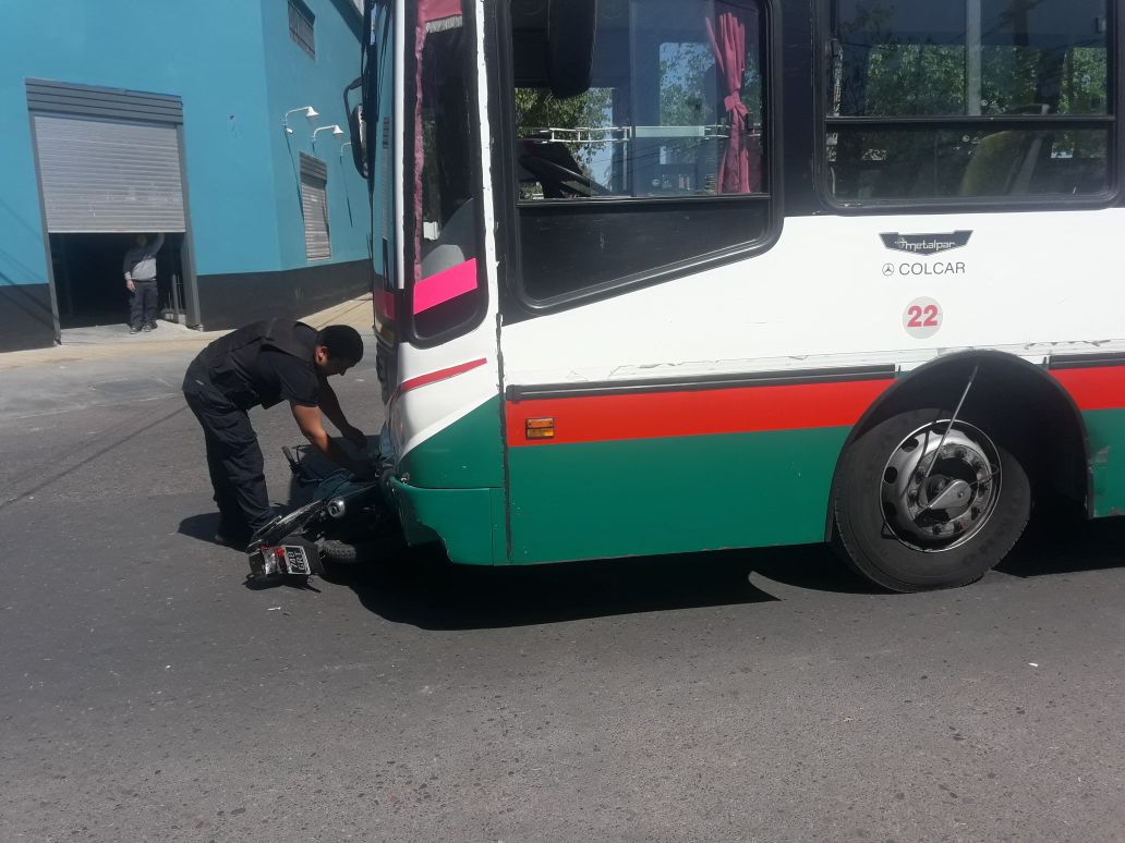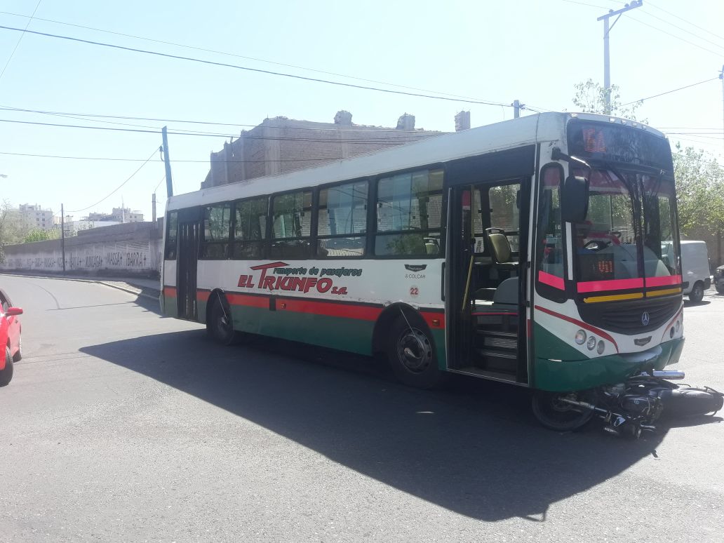 Este viernes, en la esquina de Patricias Sanjuaninas y Brasil, en Capital un colectivo chocó con una moto. Producto del impacto, el rodado menor quedó incrustado en la trompa del micro.