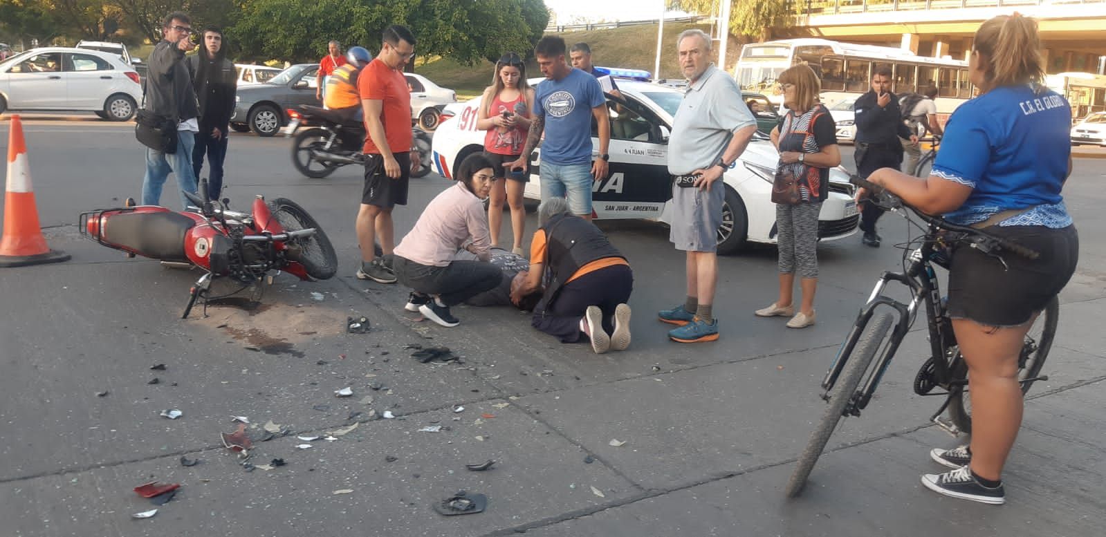 Producto del siniestro vial se generó un gran revuelo y distintos transeúntes se acercaron para reanimar al joven herido, que finalmente fue trasladado al Hospital Rawson.