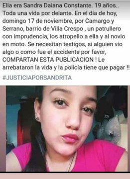 Sandra Daiana Constante (19) y su novio Ariel fueron atropellados el domingo cuando circulaban a bordo de una moto por el cruce de Serrano y Camargo, en Villa Crespo. Los embistió un patrullero de la Policía de la Ciudad y se investiga si cruzó en rojo.