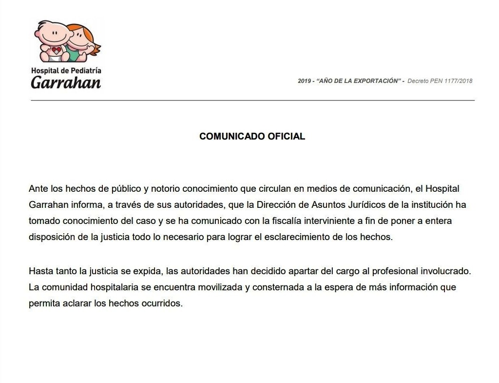 "Ante los hechos de público y notorio conocimiento que circulan en medios de comunicación, el Hospital Garrahan informa, a través de sus autoridades, que la Dirección de Asuntos Jurídicos de la institución ha tomado conocimiento del caso y se ha comunicado con la fiscalía interviniente a fin de poner a entera disposición de la justicia todo lo necesario para lograr el esclarecimiento de los hechos", redacta el comunicado.