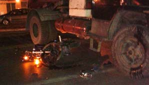 San Juan.- Antes de la medianoche de este martes, se produjo un espectacular accidente que involucró a un camionero y a un policía que viajaba en moto. Aparentemente, según informaron desde la Comisaría, el conductor del camión intentó doblar en U y el motociclista impactó contra él.
