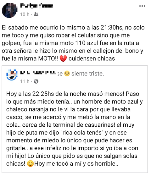“Hoy -por anteanoche- a las 22:15 de la noche pasó lo que más miedo tenía. Un hombre de moto azul y chaleco naranja, no le vi la cara por que llevaba casco, se me acercó y me metió la mano en la cola. Fue cerca de la terminal de Casuarinas”, relató la primera de las jóvenes víctimas. Y agregó: “El muy h… de p… me dijo ‘rica cola tenés’ y en ese momento de miedo lo único que pude hacer es gritarle. A ese infeliz no le importó si yo iba a con mi hijo. Lo único que pido es que no salgan solas chicas. Hoy me tocó a mí y es horrible”