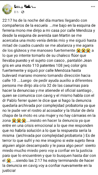 “22:17 de la noche del día martes, llegando con compañeros de la escuela. Me bajo en la esquina de Ferreria Mono me dirijo a mi casa por calle Mendoza y desde la esquina de Avenida San Martín se me acercaba una moto, venía detrás mío y me siguió hasta mitad de cuadra cuando se me abalanza y me agarra de los glúteos y me manoseo fuertemente. Yo intenté tomarlo de su chaleco flúo que llevaba puesto y el sujeto con casco, pantalón jean gris en una moto (…) color gris siguió por calle Mendoza hasta Bulevard Mariano Moreno tomando dirección hacia Calle 10”, relató otra de las víctimas.