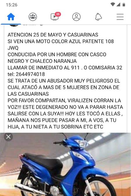 A ellas se sumó una tercera joven, que reveló: “El sábado me pasó lo mismo a las 21:30, no sólo me tocó y me quiso robar el celular, sino que además me golpeó. Fue la misma moto azul 110. A otra señora le hizo lo mismo. Cuidensé, chicas”.