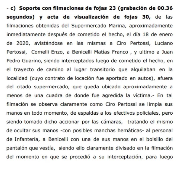 "Se observa claramente como Ciro Pertossi se limpia sus manos en todo momento, de espaldas a los efectivos policiales, pero siendo tomado dicho accionar por las cámaras, tratando el mismo de ocultar sus manos -con posibles manchas hemáticas- al personal de Infantería", indica la fiscal.