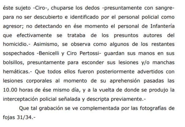 En otra línea, Zamboni agrega: "éste sujeto -Ciro-, chuparse los dedos -presuntamente con sangrepara no ser descubierto e identificado por el personal policial como agresor; no detectando en ése momento el personal de Infantería que efectivamente se trataba de los presuntos autores del homicidio".