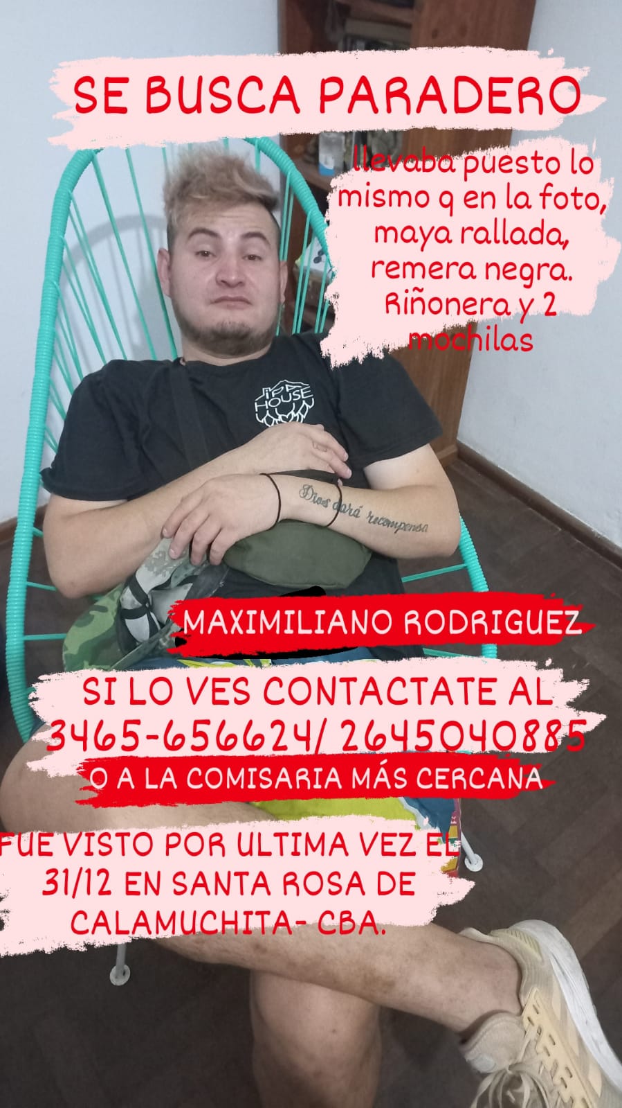 Al momento de su desaparición, Maximiliano tenía una bermuda rayada, una remera negra, riñonera y dos mochilas.