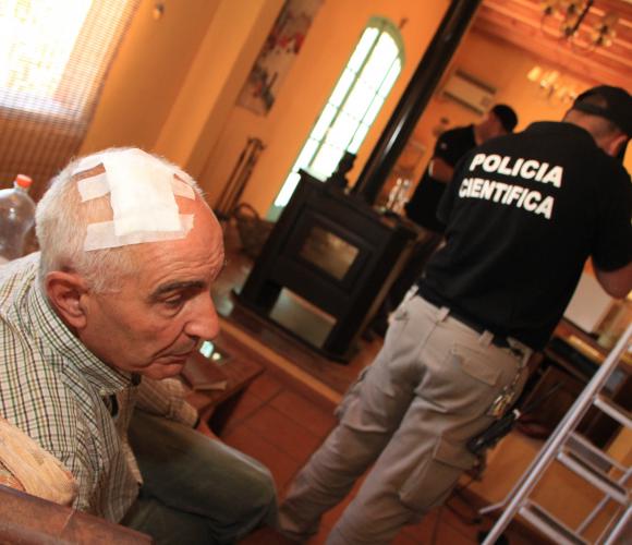 Ayer fue más violento. Moncho acababa de llegar a su casa y se sentó a comer una pizza. En eso que miraba televisión a las 0.15, fue sorprendido por el golpe en la puerta. ‘Cuando escuché el estruendo y me di la vuelta, sentí el palo en la cabeza. No pude hacer nada y trastabillé. Ahí escuché que me gritaban: arrodillate viejo, arrodillate‘, relató el empresario que terminó en el piso con la cabeza ensangrentada y rodeado por cuatro encapuchados, quienes ataron sus manos con las tiras de las cortinas y sujetaron sus pies con un par de cintos. Lo dejaron tirado boca abajo y empezaron a exigirle dinero, también le preguntaron si tenía armas, a lo cual Moncho respondió que no sabía dónde las había guardado su hijo. Minutos después, uno de los ladrones encontró la escopeta calibre 12 del empresario y lo encañonó en la cabeza diciéndole: ‘viste que me estás mintiendo‘.