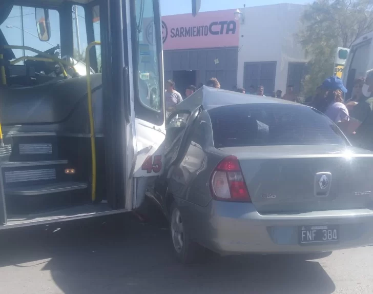 En la mañana de este lunes se produjo un fuerte accidente de tránsito entre un colectivo de la línea 260 y un auto Renault Clio, en Media Agua, Sarmiento.