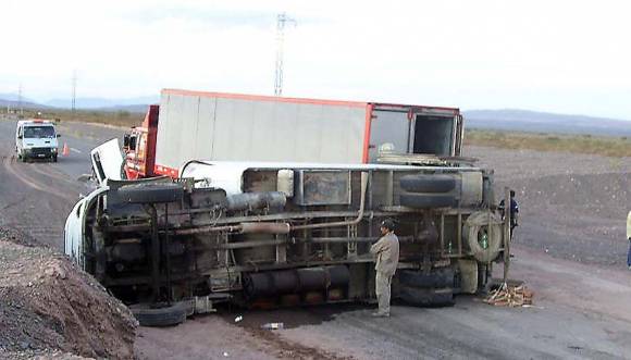 El conductor de un camión frigorífico cargado con pollos con destino a Jáchal sufrió ayer un gran susto luego de perder el control del vehículo en un badén y terminar de costado, metros al Norte del ingreso al camino de la zona de Tucunuco, unos 40 km. al Sur del centro del centro jachallero, informaron fuentes policiales. Ocurrió minutos después de las 18. En la comisaría 21ra. dijeron que tanto el camión Mercedes Benz 1114 como la carga (que no salió de la caja) pertenecen a la empresa "Un Rincón de Nápoli’, y que su chofer Julio Walter Vera (62) apenas sufrió lesiones leves.