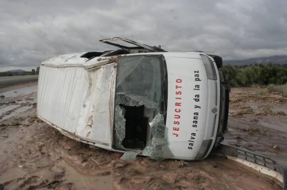 Cuatro personas se llevaron un gran susto el miércoles a las 23.20, cuando el agua acumulada por las intensas lluvias hizo volcar a la Renault Master en la que viajaban y los arrastró varios metros por calle 15, entre ruta 40 y Mendoza, Pocito. Según la policía, Roberto Zuim (34 años, mendocino) y Julia Rubio (65 años, española) sufrieron heridas leves. Eduardo González (38), el chofer, y un joven de 17 años, salieron ilesos, informó la policía.