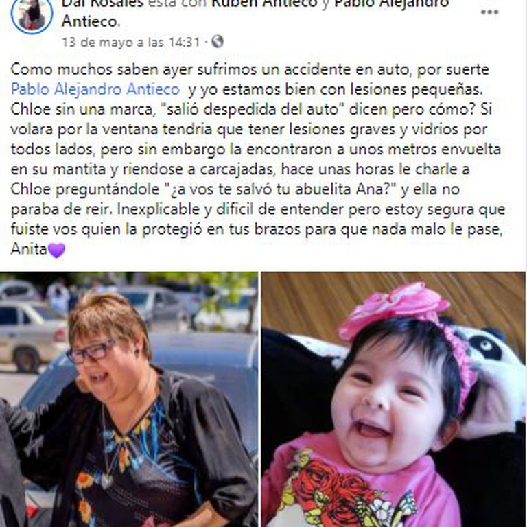 Dai Rosales, su mujer, también utilizó esa misma red social para contarle a sus amigos y familiares que todos ya fueron dados de alta. “Estamos bien, con lesiones pequeñas. Chloe sin una marca”, remarcó para llevar tranquilidad a sus seguidores. “A Chloe la encontraron a unos metros envuelta en su mantita y riéndose a carcajadas”, detalló aún asombrada por lo sucedido.